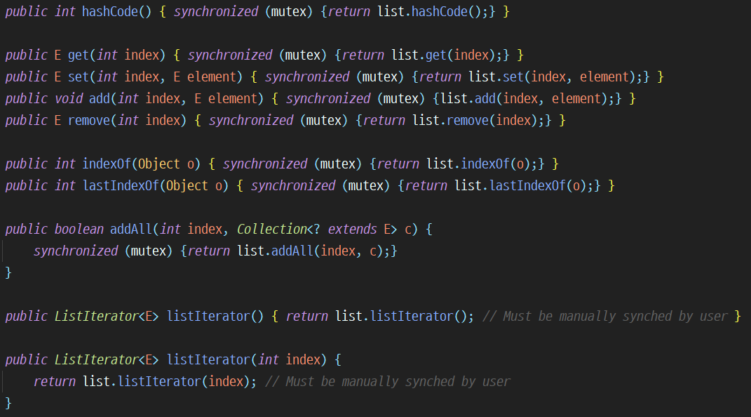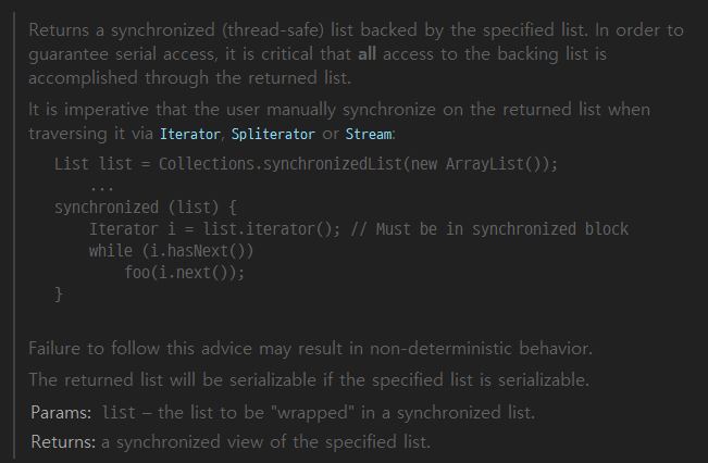 Collections.synchronizedList 주석을 보면 Iterator, Spliterator, Stream은 동기화가 필요하다고 작성돼있다. 내부 구현을 보면 Iterator은 따로 동기화 처리하지 않았다는 점을 알 수 있다.